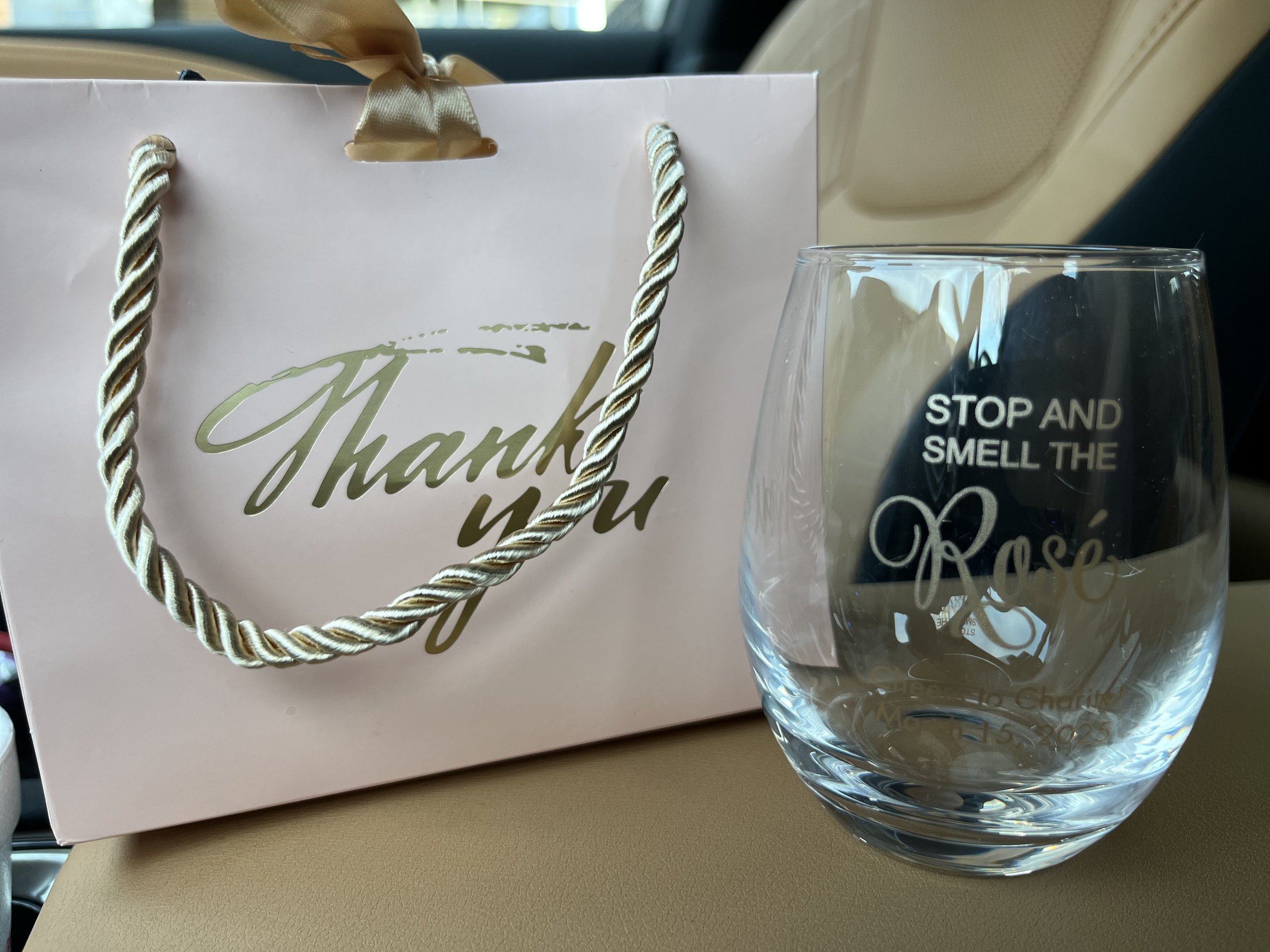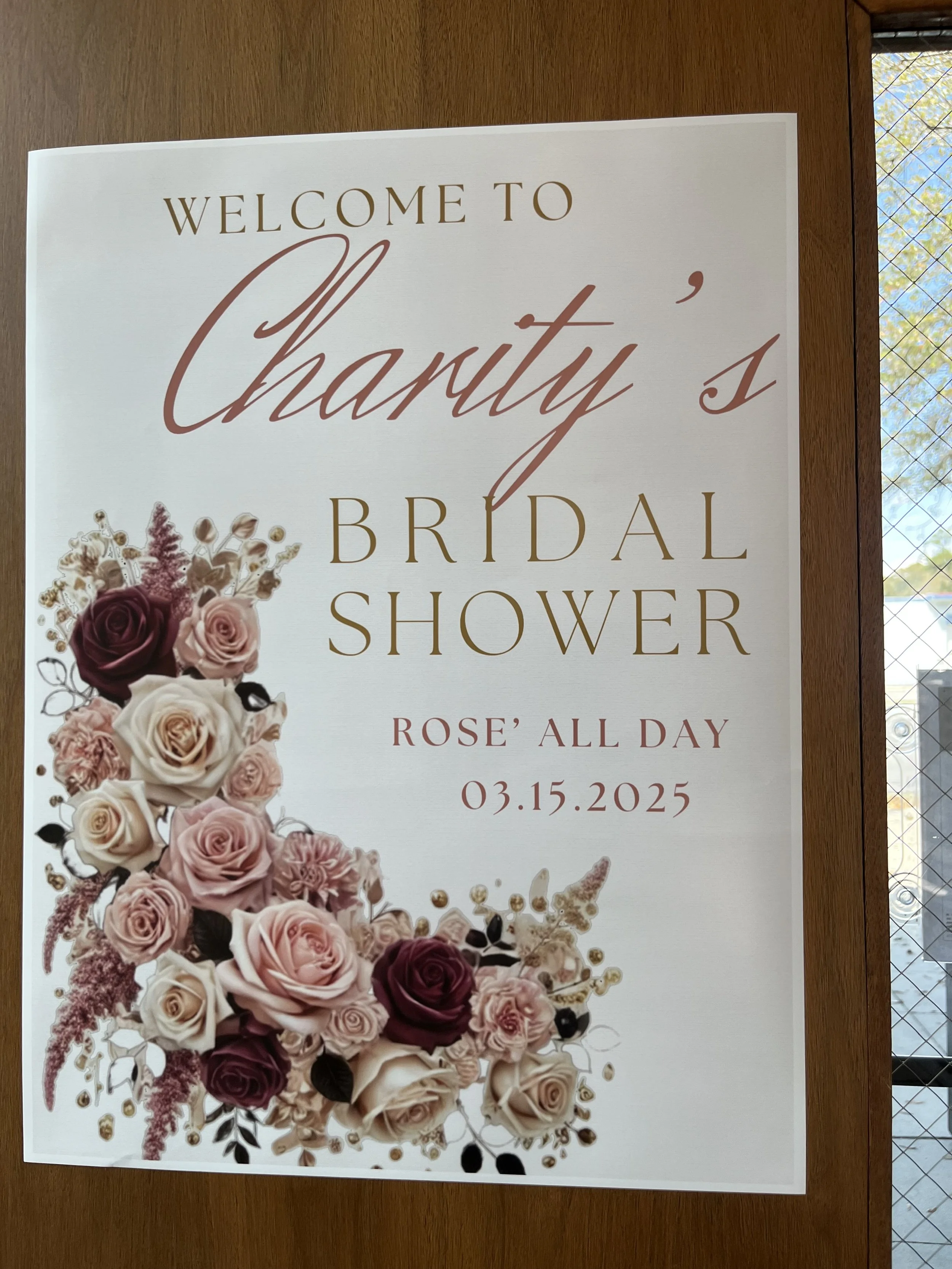 A custom event design suite created for Charity's Rosé All Day Bridal Shower. The collection includes a custom welcome sign in a soft floral palette of blush, dusty rose, and burgundy, along with personalized thank you bags and custom engraved wine glasses — each detail designed to feel intentional and memorable.